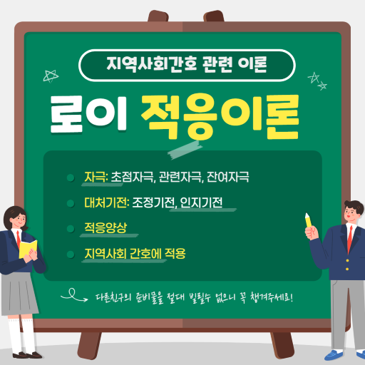 로이의 적응이론의 주요 개념으로 자극, 대처기전, 적응양상이 있습니다. 자극은 인간의 발달과 행동에 영향을 미치는 모든 주위 상황이나 인간 내부에서 일어나는 상태가 적응체계인 인간에게 투입되는 것입니다. 자극은 초점자극, 연관자극, 잔여자극이 있다. 초점자극은 자극 중에서 인간이 행동을 하게 만드는데 가장 큰 영향을 미치는 사건이나 상황의 변화입니다. 이때 사건이나 상황의 변화는 인간에게 즉각적이거나 직접적으로 영향은 미친다. 관련자극은 연관자극이라고도 합니다. 초점자극을 제외한 인간의 행동을 유발하는 것과 관련된 다른 모든 자극을 말합니다. 현재 인간의 상태에 영향을 미치는 측정할 수 없는 내적, 외적 세계에 존재하는 자극입니다. 잔여자극은 인간이 생동에 간접적으로 영향을 줄 수 있는 요인을 말합니다. 측정이 어려운 신념, 태도, 성품 등이 해당됩니다. 인간이 변화하는 환경에 대처하는 능력을 대처기전이라고 합니다. 일부 대처기전은 유전으로 결정되기도 합니다. 대부분은 후천적으로 학습을 통해 습득됩니다. 대처기전은 조정기전과 인지기전이 있습니다. 조정기전은 조절기전이라고도 하며 항상정 조절능력입니다. 자극이 투입되면 중추신경계의 통로를 통하여 자율신경계 반응 또는 호르몬계반응, 정신신체반응이 일어나는데 이러한 반응을 주로 관장하는 기전입니다. 대부분 자동적이고 무의식적인 반응으로 나타납니다. 인지기전은 자극이 투입되면 인지적 정보처리과정, 판단, 학습, 정서과정을 통하여 사회심리적 반응이 일어나는 기전입니다. 인지적 정보처리과정은 기억, 주의집중에 대한 행동을 관장합니다. 판단은 문제해결과 의사결정에 대한 행동을 관장합니다. 학습은 모방과 강화의 반응으로 일어나는 행동을 관장합니다. 정서과정은 애착, 불안해소 등의 행동을 관장합니다.대처기전으로 인해 나타나는 적응방법의 여러 가지 종류를 적응양상이라고 합니다. 인간의 기본적인 욕구들입니다. 생리적 양상, 자아개념 양상, 역할기능 양상, 상호의존 양상이 있습니다. 생리적 양상은 환경의 자극에 대한 인간의 신체적 반응을 말합니다. 기본욕구에 신체가 반응하는 양상입니다. 적응양상은 생리적 통합성에 대한 문제해결이 이루어져서 조절이 되는 것입니다. 수분, 전해질, 감각, 체온, 내분비, 영양, 배설에 대한 기본욕구가 조절되는 것을 의미합니다. 자아개념 양상은 정신적 통합성을 유지하기 위해 발생하는 적응양상입니다. 자아개념은 본인에 대한 인식으로 신념과 느낌의 복합체입니다. 신체적 자아와 개인적 자아로 나누어집니다. 신체적 자아는 자신의 신체에 대한 주관적인 생각으로 신체적으로 본인을 지각하고 형성하는 능력입니다. 감각과 신체상이 여기에 포함됩니다. 개인적 자아는 스스로의 성격, 기대, 가치에 대한 평가입니다. 자아일관성, 자아이상, 자아기대, 윤리적 자아가 포함됩니다. 역할기능 양상은 사회적 통합성에 따른 적응양상입니다. 사회적 통합성을 유지하기 위해 다른 사람과 상호작용하고 본인에게 적절한 행동과 역할을 합니다. 역할기능은 세 가지로 나누어지는데 일차적 역할, 이차적 역할, 상차적 역할이 있습니다. 일차적 역할은 선택할 수 없는 것으로 성별, 연령 등이 해당됩니다. 이차적 역할은 선택한 후 내 역할이 되는 것으로 아내, 남편 등이 있습니다. 삼차적 역할은 일시적 역할로 일시적인 팀장 역할이 해당됩니다. 역할기능에 문제가 발생하면 역할상실이나 역할갈등을 초래할 수 있습니다. 상호의존 양상은 사회적 통합성 중 상호작용에 초점을 둔 적응방법입니다. 상호의존감이란 독립심과 의존심 사이의 균형을 말합니다. 의미 있는 타인이나 지지관계와 여러 가지 사랑, 존경, 가치를 주고받는 것과 관련이 있습니다. 적응을 적절하게 하지 못하면 이탈성, 지배성, 소외감, 거부, 경쟁심이 나타나게 됩니다.