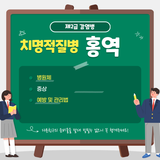 홍역은 제2급 법정감염병입니다. 제2급 법정감염병은 전파의 우려가 있어서 격리가 필요한 감염병입니다. 홍역은 감수성지수가 95% 정도입니다. 감수성지수는 접촉감염지수입니다. 접촉감염지수는 감수성이 있는 사람이 감염자와 접촉했을 때질병에 걸리는 확률을 나타내는 것입니다. 홍역은 법정 감염병 중에서 가장 감염력이 강합니다. 병원력도 강한 편인데 병원체가 몸에 들어와서 감염이 되면 대부분의 사람에게 증상이 나타납니다. 그래서 불현성 감염이 거의 없습니다. 일반적으로 1~2세의 어린 영아가 많이 감염되는 편입니다. 최근에는 대부분의 어린이들이 예방접종을 맞아서 예방접종을 하지 않은 성인의 감염률이 더 높습니다. 주증상으로 발열과 발진을 보입니다. 병원체는 홍역바이러스입니다. 전파방법으로 분비물과 접촉으로 인한 직접전파, 호흡기 분비물로 인한 비말전파가 있습니다. 홍역바이러스는 공기 중에서 2시간 이상 생존이 가능하기 때문에 공기전파가 되기도 합니다.